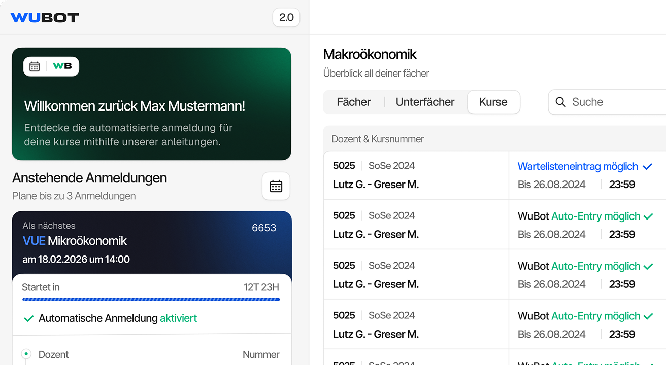 WuBot automatisiert deine LPIS-Anmeldung an der WU Wien und registriert dich deutlich schneller für Wunschkurse, Prüfungen und Veranstaltungen. Aktiviere einfach deine gewünschte Veranstaltung – WuBot übernimmt den Rest.
