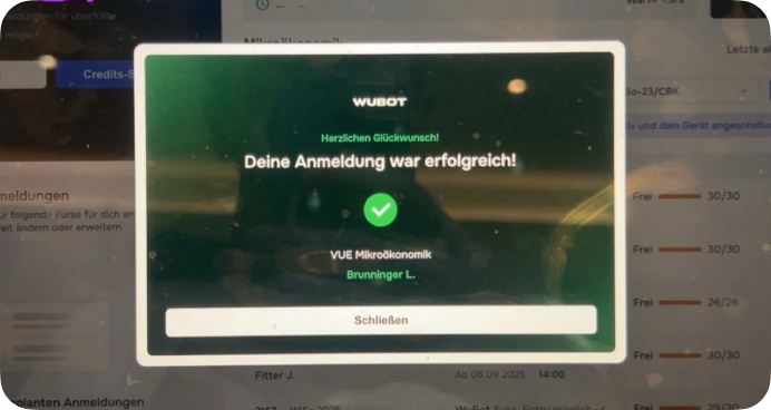 Halte die Software beim Kursstart geöffnet und sieh live zu, wie WuBot sich blitzschnell für dich anmeldet.
